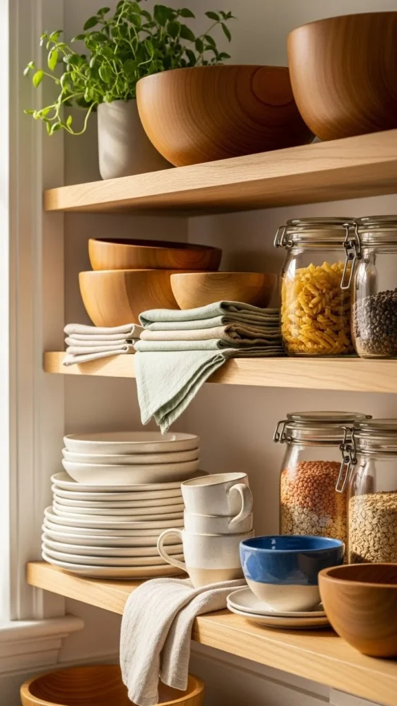 Designer kitchens always balance beauty and usefulness. Your shelves shouldn’t feel like a showroom—they should work for daily life.